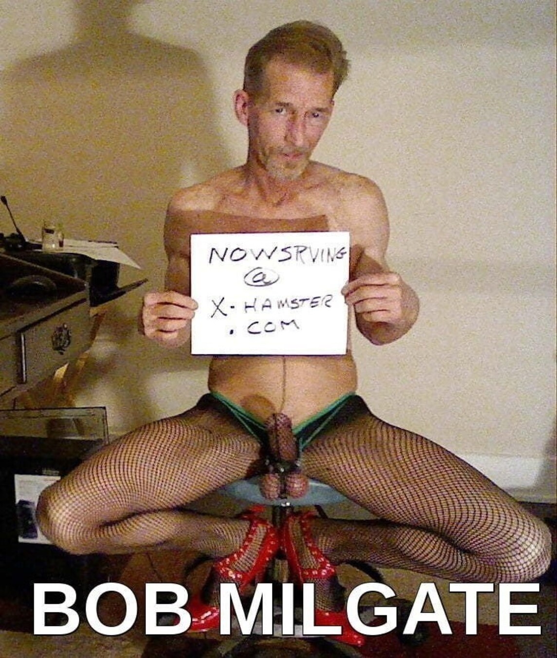 BOB MILGATE EXPOSED COMPLETELY AND TOTALLY WEARING ONLY BLACK FISHNET PANTYHOSE AND HIGH HEELS