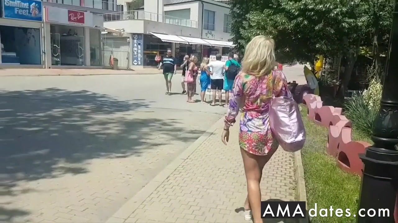A hot blonde MILF enjoys a day at the beach and meets a stranger. Things get steamy as they head to a hotel room for intense sex, with rough play and toy fun.