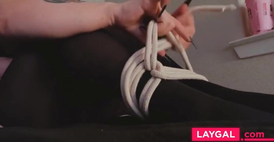 Tying myself up in stockings before my boyfriend for BDSM fun