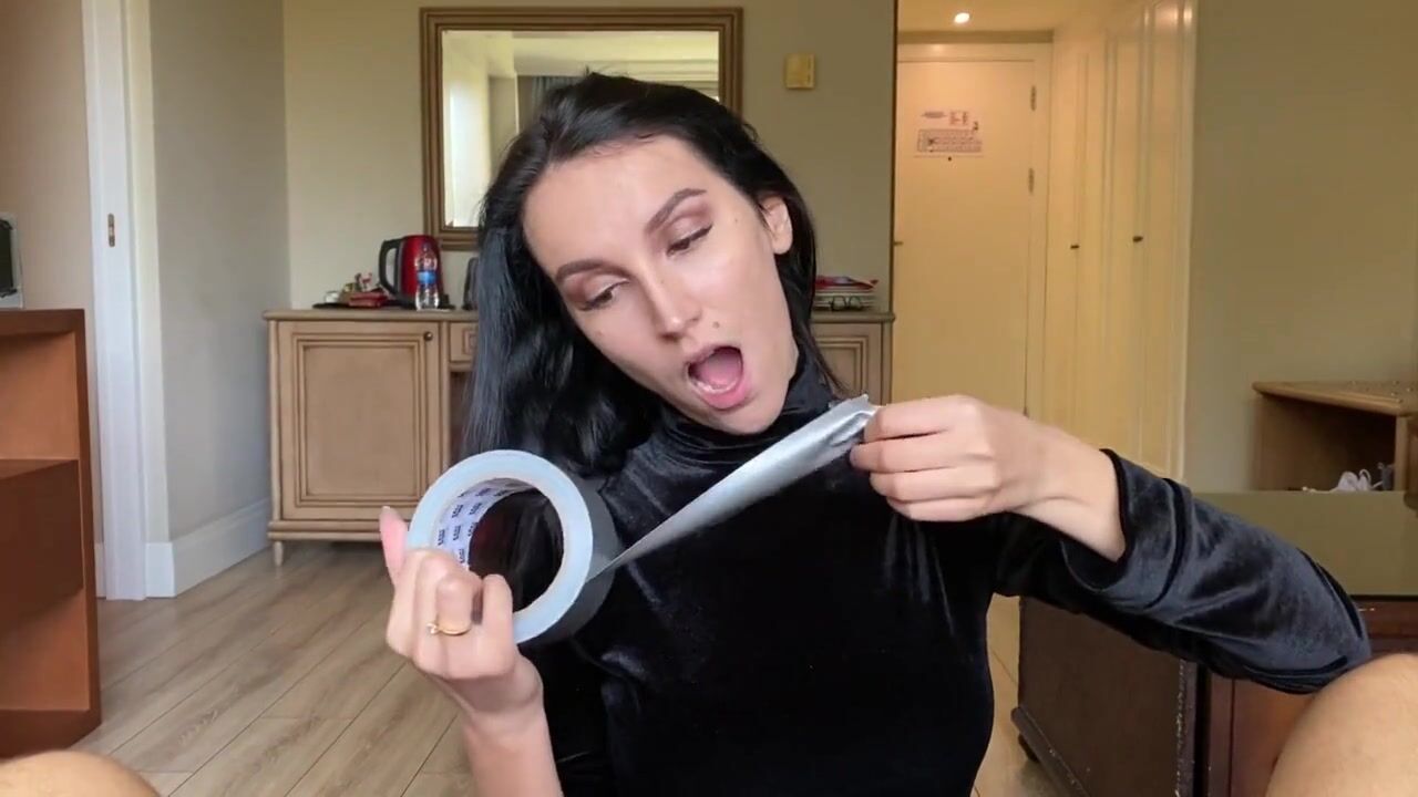 A hot brunette babe in a velvet dress gets kinky, taping her partner's mouth shut before giving him a POV handjob. She teases him until he cums all over her pretty face, with her big dick delivering a hot load.