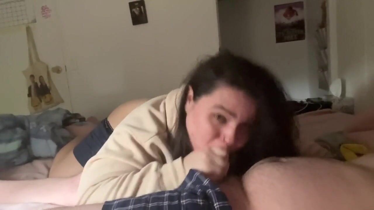This video features a surprise cum in mouth! A brunette BBW gives a blowjob to a small-dicked man, but he cums prematurely and unexpectedly, leading to a clothed oral creampie. She's shocked but keeps stroking, twisting her hand. A real amateur surprise!.