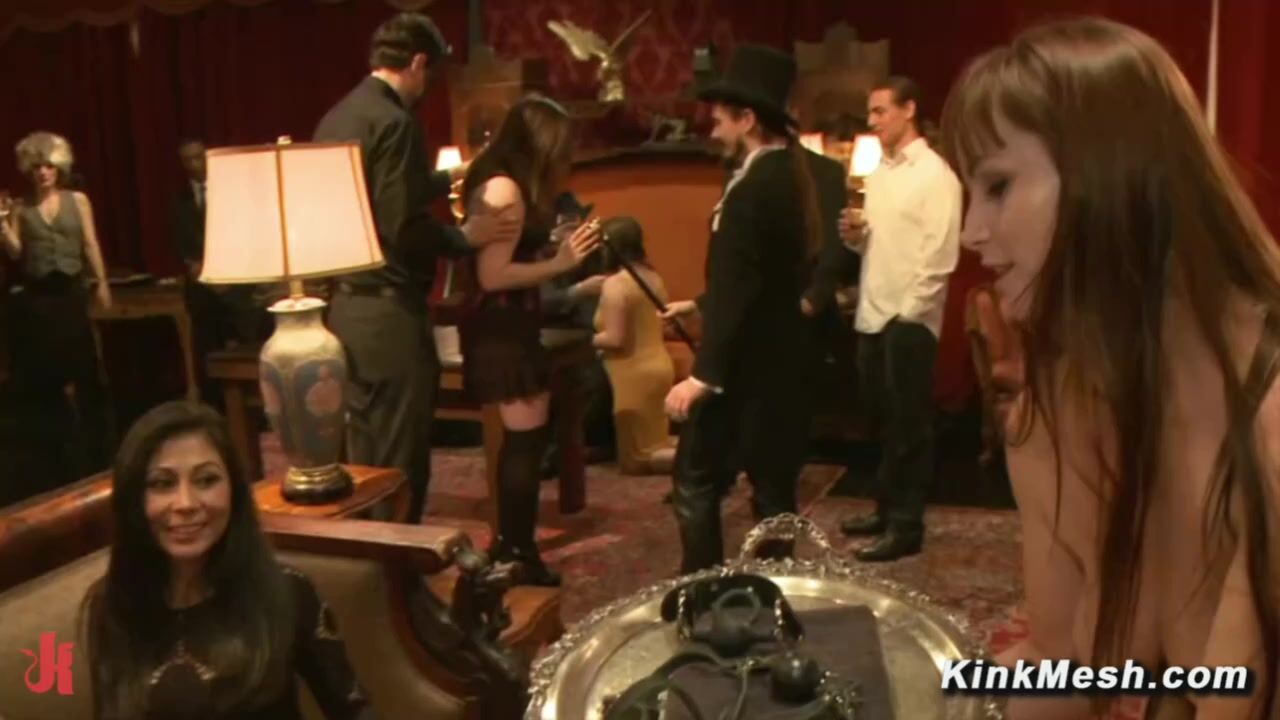 Two hot slaves Bella Rossi and Kristine Kahill are ordered to service the lounge in their fetish lingerie and they are humiliated and punished featruing whip and flogger and dildo BDSM orgy party