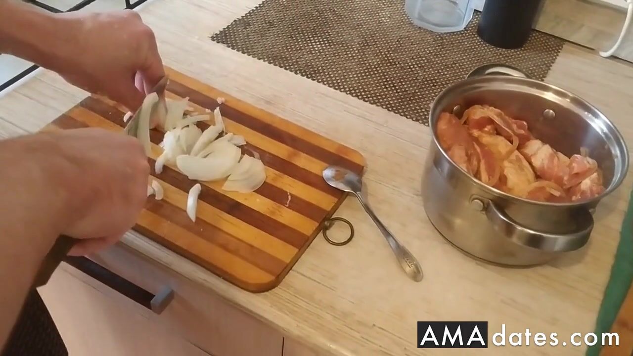 My husband was in the kitchen, so I joined him and couldn't resist stuffing some fruit into my tight pussy. I'm a blonde babe with a big ass and a taste for kinky fun, and this video shows me masturbating with a sex toy and fruit, gaping my pussy, and even fucking while dressed. It's a homemade, amateur clip with a twist!