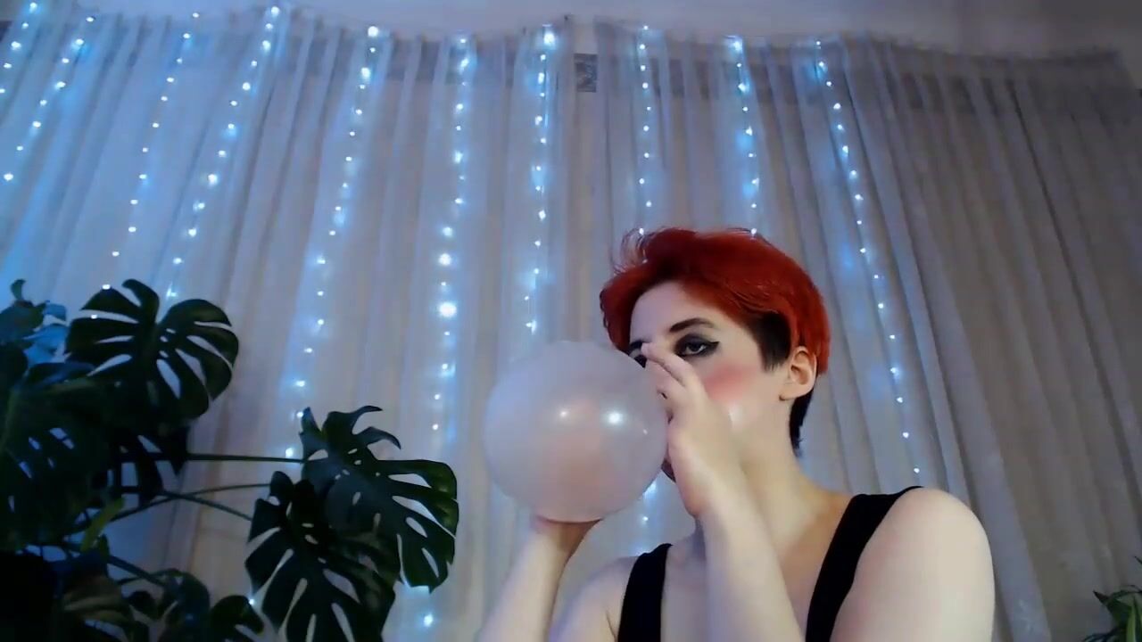A sexy Arab camgirl teases with balloons in a public show, showcasing her natural hairy beauty, big ass, and red hair while wearing nylons and heels. She blows up balloons, teases with a no-pop promise, and humps seductively with BDSM undertones.