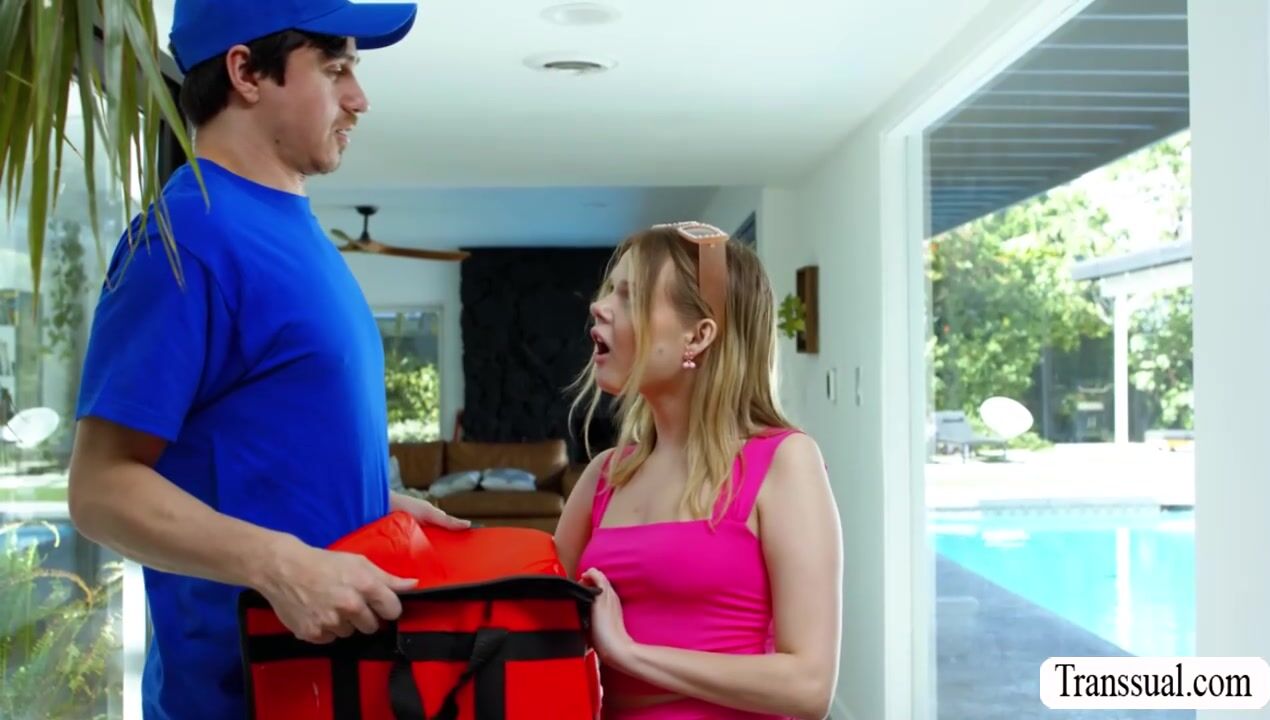 Busty shemale stepmother caught her stepdaughter flirting with the delivery man.She got mad and brings the delivery man into her room and suck his dick before she rides it.Go to Transsual.com for the full video of this and more related.