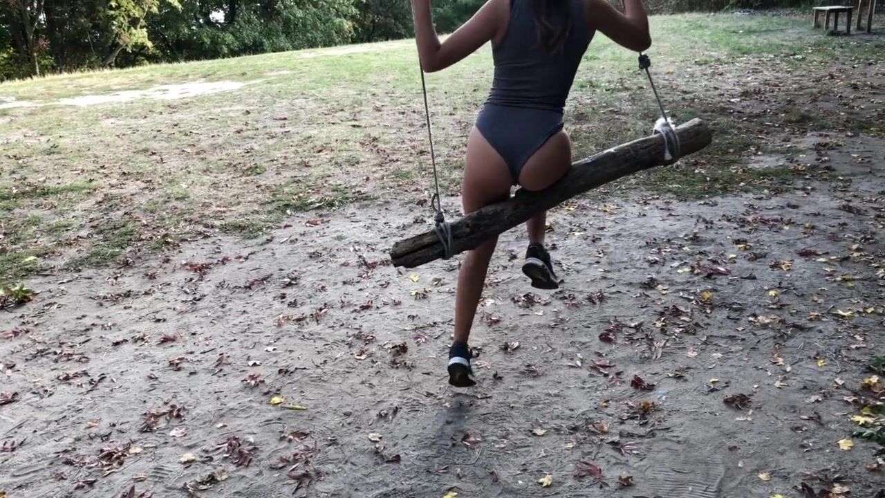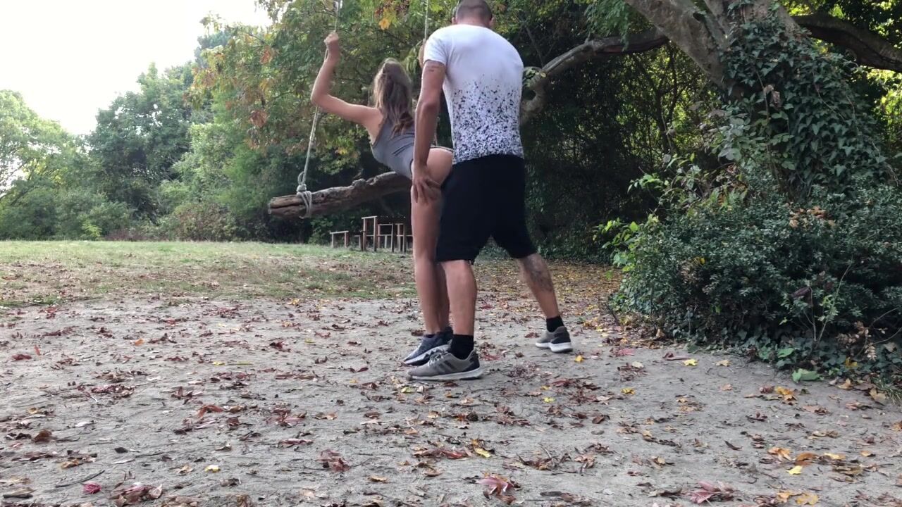 A hot amateur babe with a big ass and big tits enjoys a risky outdoor adventure, riding her sexy boyfriend's cock in a park, with nature all around, ending in a body-slapping, cum-shooting orgasm.