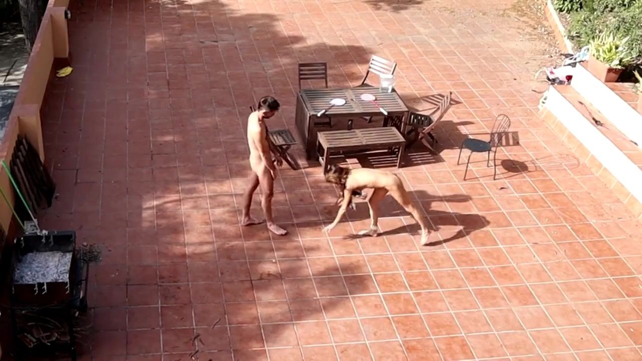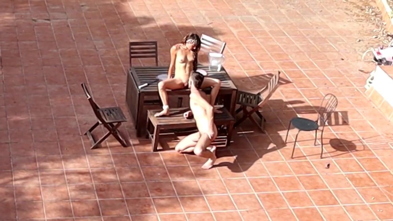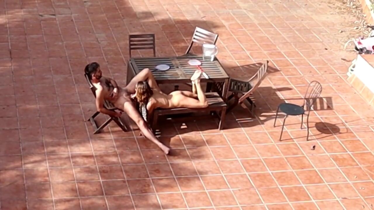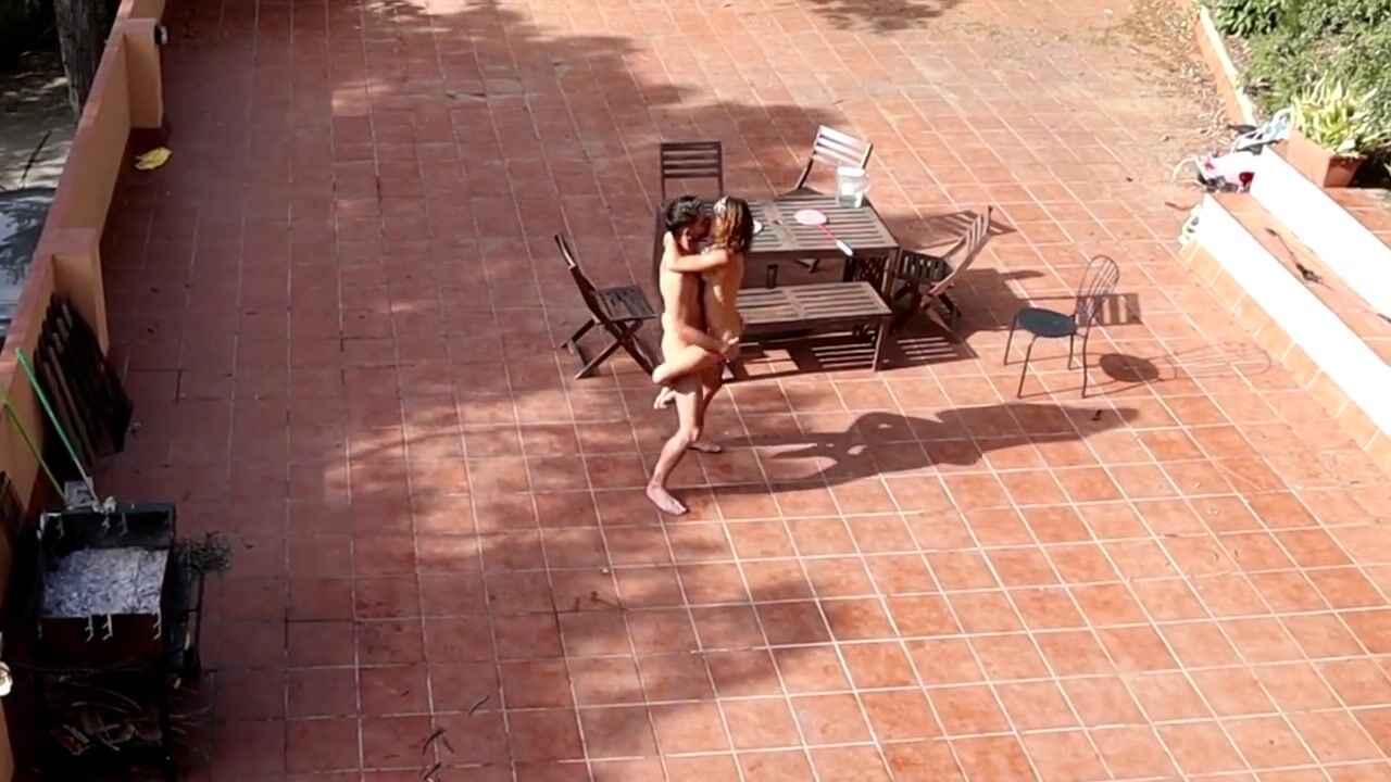 Public Courtyard Blowjob and Fucking with a Hot Brunette Amateur Couple
