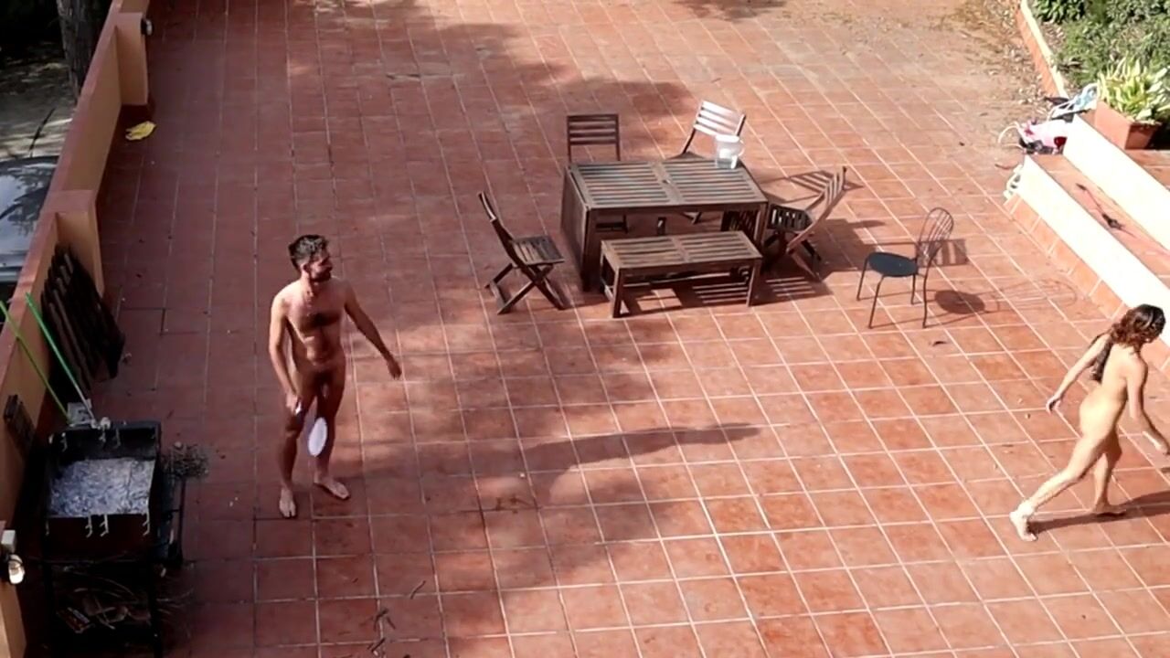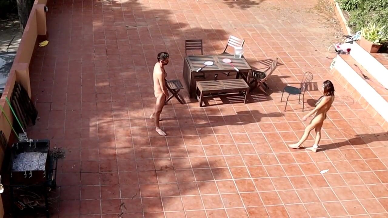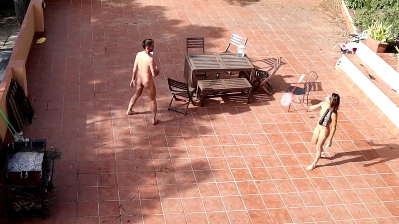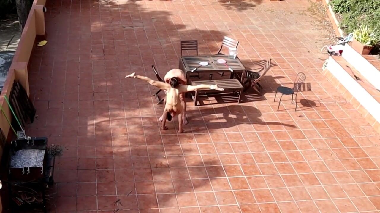 Public Courtyard Blowjob and Fucking with a Hot Brunette Amateur Couple