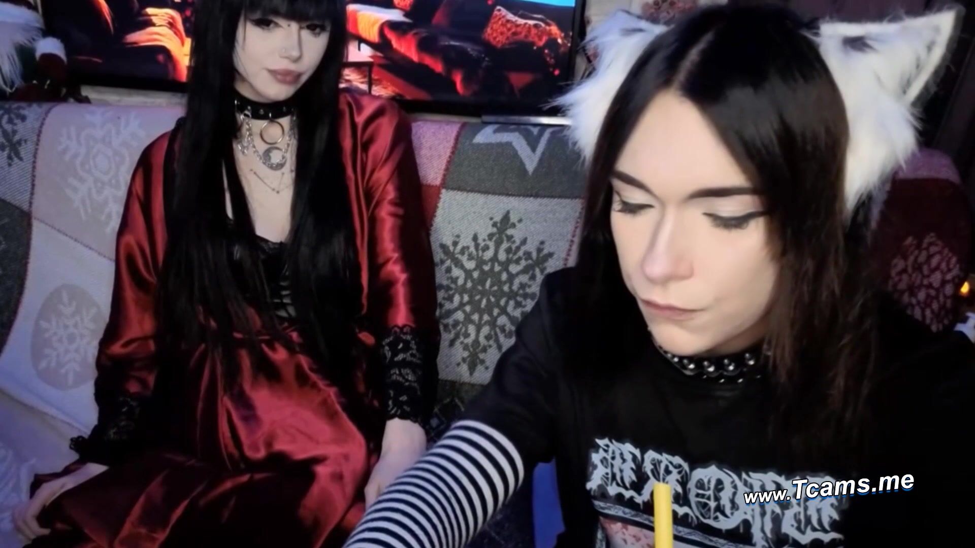 In a cozy room lit by a TV screen, a stunning babe in a shiny red satin dress lounges seductively on a patterned couch next to a gorgeous transwoman in a black metal band T-shirt and striped sleeves, accessorized with a choker. The transwoman playfully points at the camera while the babe leans in close, their long dark hair cascading. This captivating duo performs on a live webcam show via tcams.me, teasing viewers with intimate moments. Later, the transwoman reveals her feet for playful interaction, as the babe toys with them sensually, building to an erotic climax where she eagerly licks and rims the transwoman's ass