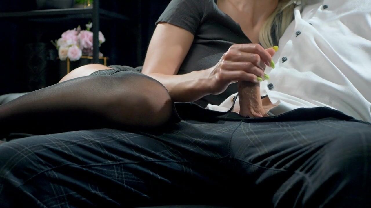 A loving wife gives her husband a sensual surprise with a gentle handjob, stroking his cock passionately until he cums hard. Her black stockings and mini dress add to the allure as she edges and teases him in this intimate, romantic encounter.
