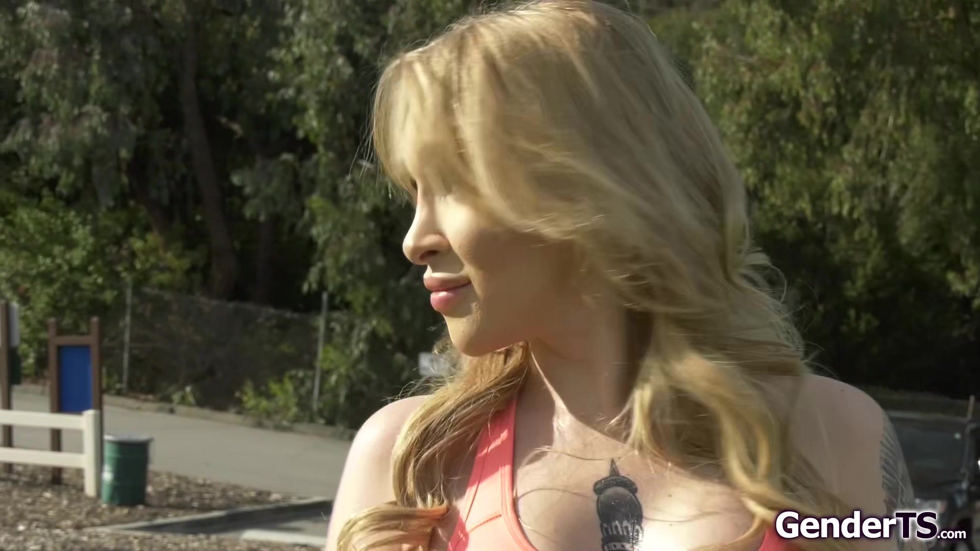 Busty trans Angelina Please hired a fitness trainer to get her in shape.The guy pushes the big tits shemale to the max and makes her suck his cock while lifting weights.The tattooed blonde tgirl is bend over and gets her tranny ass anal barebacked
