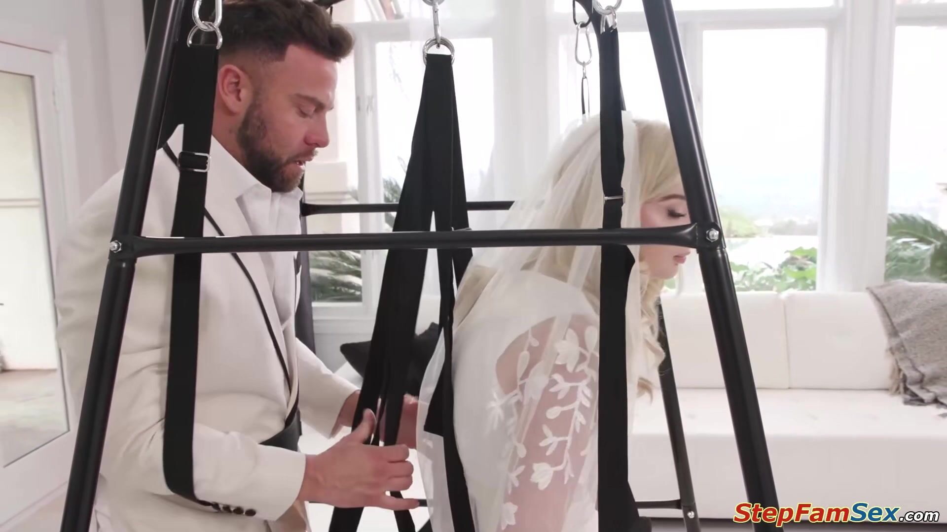 Bride Lexi Lore is shocked that her brotherinlaw gave her a sex swing.She sees hes sad about her reaction and will try it out.The blonde pulls up her dress and lets him fuck his sisterinlaws shaved pussy.The babe deepthroats and is banged some more